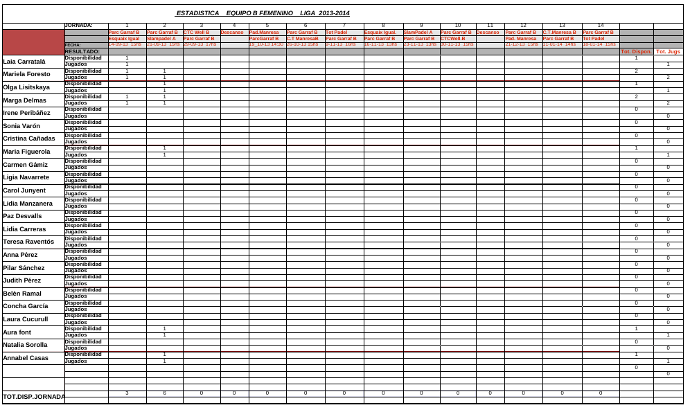 Aún no está completa, ya que el original es mucho mas complejo, pero a modo de ejemplo, servirá. El propósito de esta estadística, es saber en todo momento, la actividad de los jugadores con respecto al equipo, saber quien juega, cuando, y cuantas veces ha estado disponible para jugar.